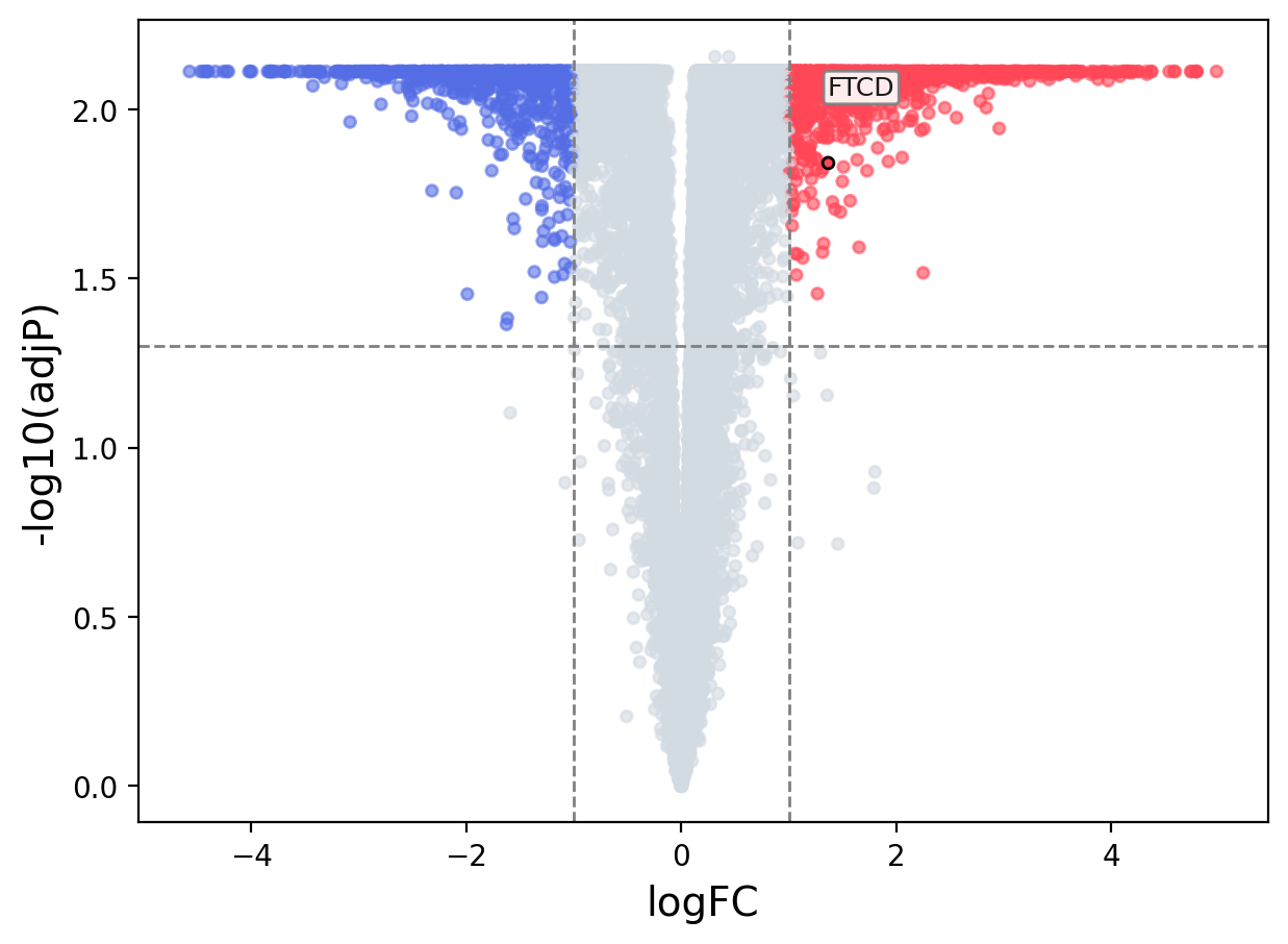 When the query gene is differentially changed in the dataset, a volcano/bar plot will be displayed.