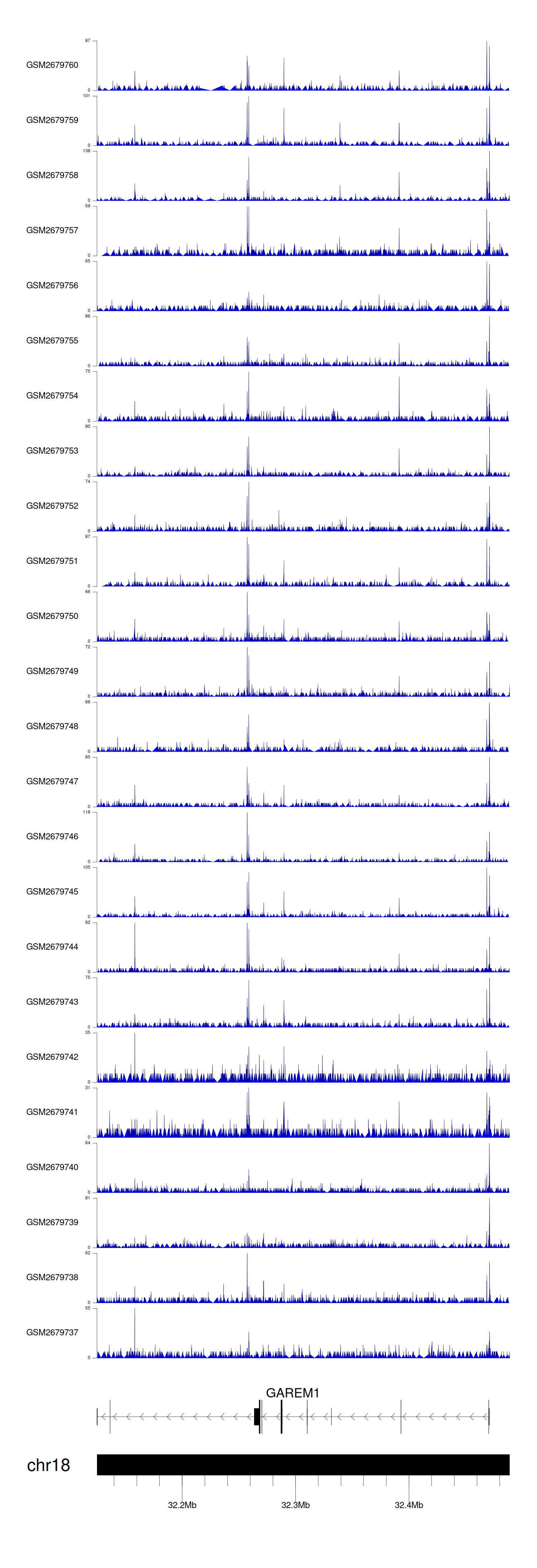 > Dataset: GSE30738 - GAREM1 peak across samples