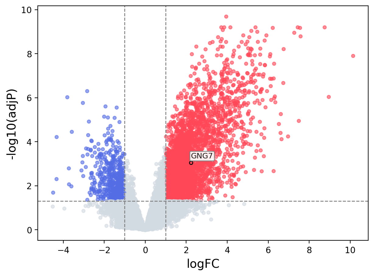 When the query gene is differentially changed in the dataset, a volcano/bar plot will be displayed.
