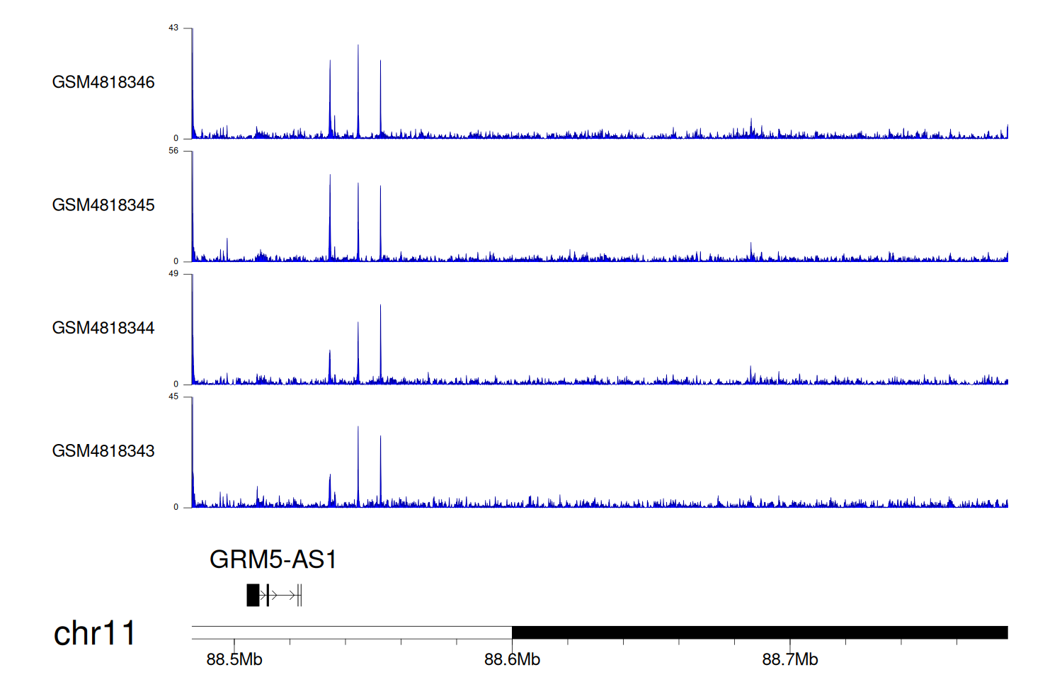 > Dataset: GSE131257 - GRM5-AS1 peak across samples