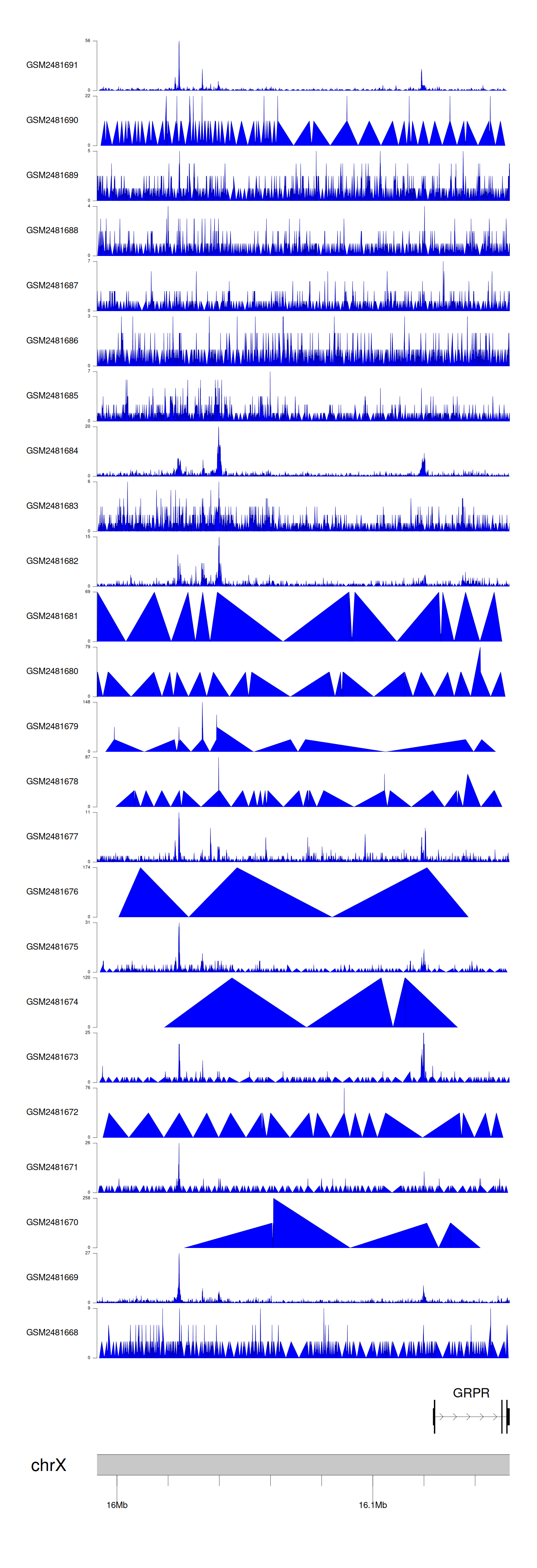 Gastrin-releasing peptide (GRP) regulates numerous functions of the gastrointestinal and central nervous systems, including release of gastrointestinal hormones, smooth muscle cell contraction, and epithelial cell proliferation and is a potent mitogen for neoplastic tissues. The effects of GRP are mediated through the gastrin-releasing peptide receptor. This receptor is a glycosylated, 7-transmembrane G-protein coupled receptor that activates the phospholipase C signaling pathway. The receptor is aberrantly expressed in numerous cancers such as those of the lung, colon, and prostate. An individual with autism and multiple exostoses was found to have a balanced translocation between chromosome 8 and a chromosome X breakpoint located within the gastrin-releasing peptide receptor gene. [provided by RefSeq, Jul 2008] |