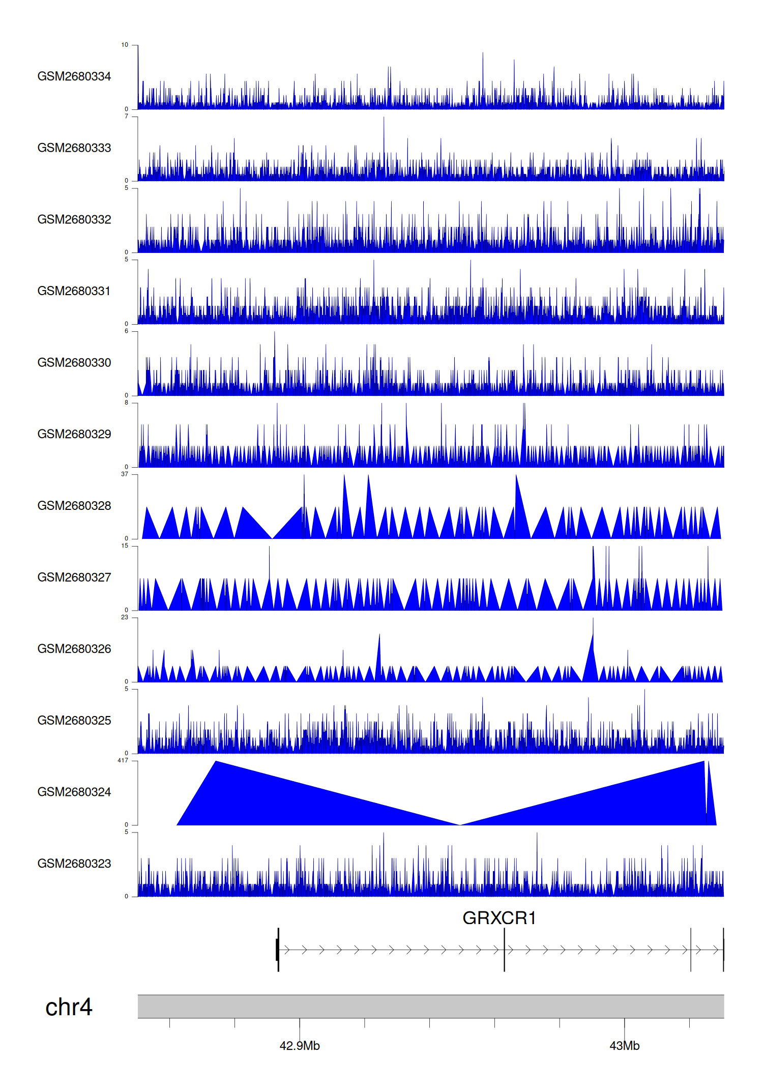 > Dataset: GSE68402 - GRXCR1 peak across samples