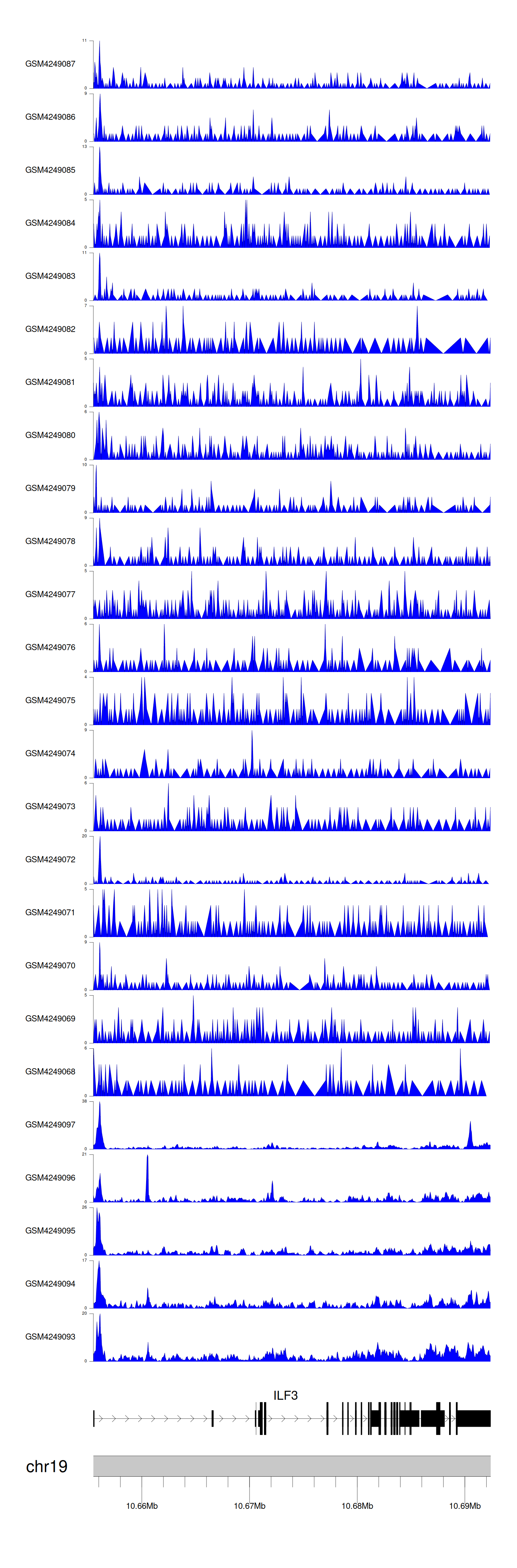 Summary This gene encodes a double-stranded RNA (dsRNA) binding protein that complexes with other proteins, dsRNAs, small noncoding RNAs, and mRNAs to regulate gene expression and stabilize mRNAs. This protein (NF90, ILF3) forms a heterodimer with a 45 kDa transcription factor (NF45, ILF2) required for T-cell expression of interleukin 2. This complex has been shown to affect the redistribution of nuclear mRNA to the cytoplasm. Knockdown of NF45 or NF90 protein retards cell growth, possibly by inhibition of mRNA stabilization. In contrast, an isoform (NF110) of this gene that is predominantly restricted to the nucleus has only minor effects on cell growth when its levels are reduced. Alternative splicing results in multiple transcript variants encoding distinct isoforms.[provided by RefSeq, Dec 2014]