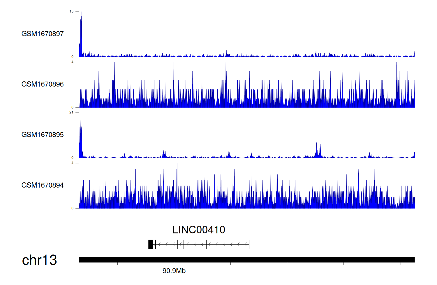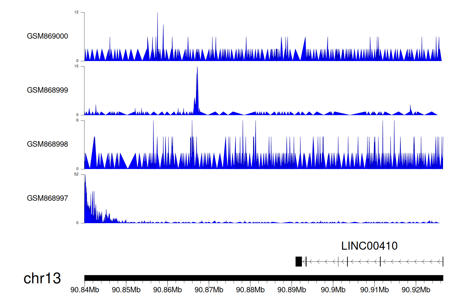 > Dataset: GSE68402 - LINC00410 peak across samples