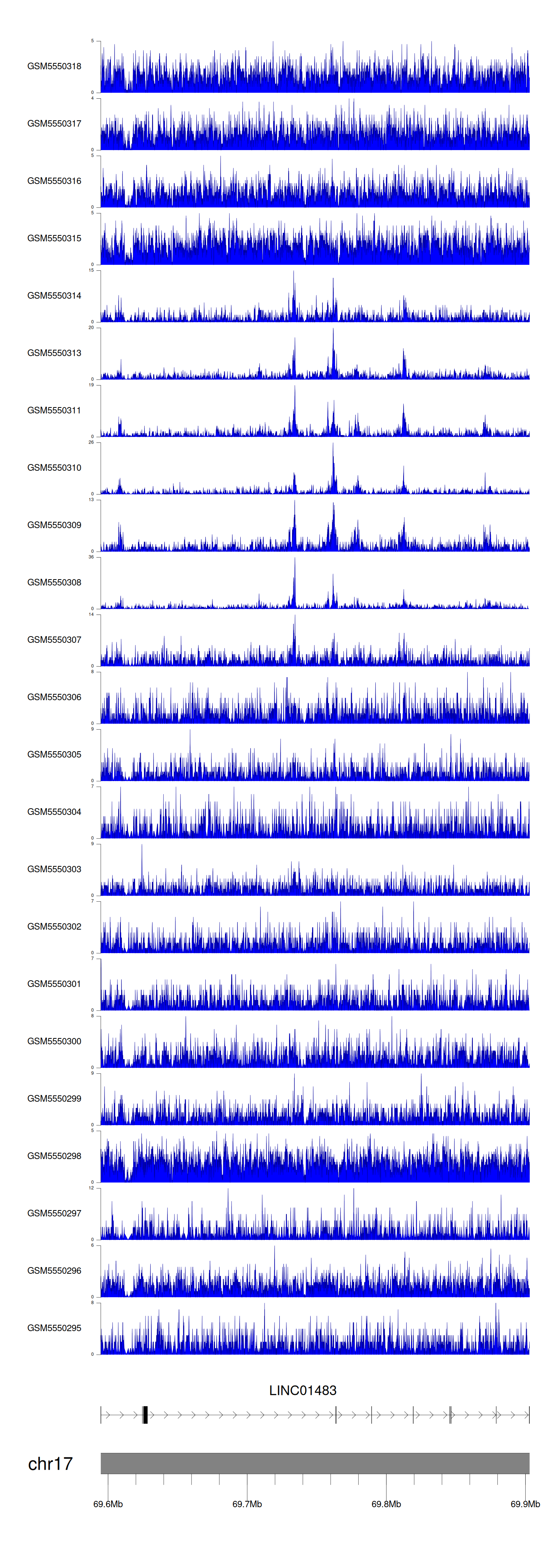 > Dataset: GSE143026 - LINC01483 peak across samples