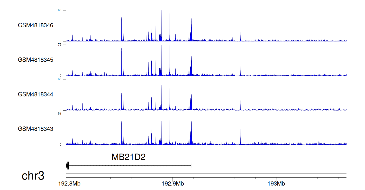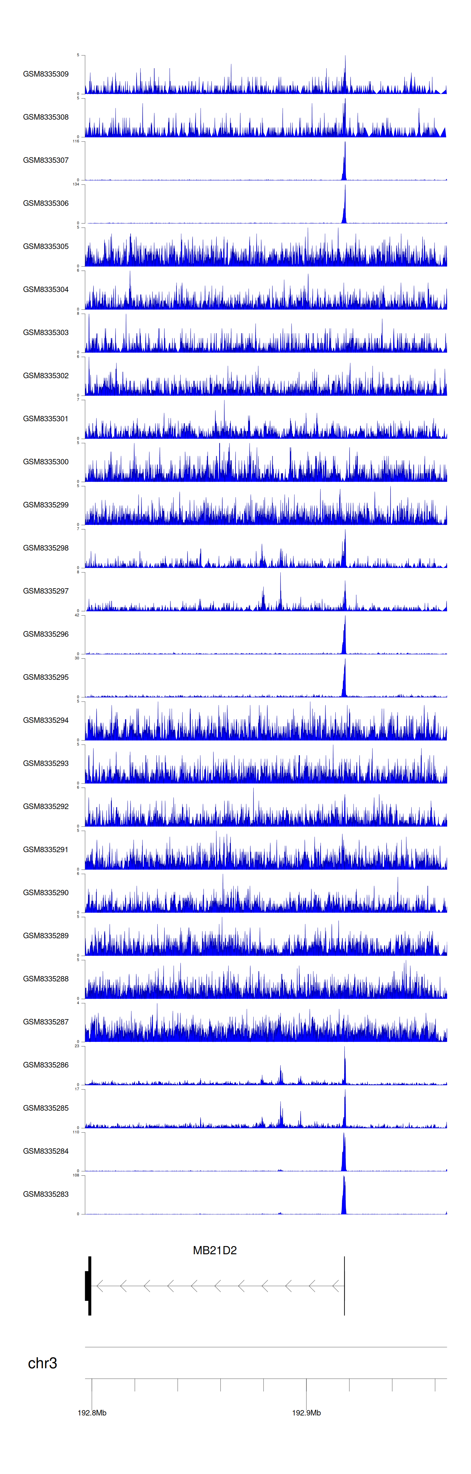 > Dataset: GSE131257 - MB21D2 peak across samples