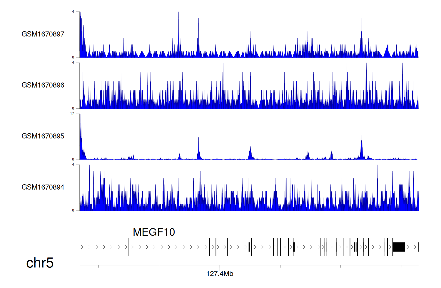 > Dataset: GSE68402 - MEGF10 peak across samples