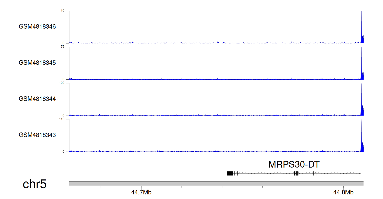 > Dataset: GSE131257 - MRPS30-DT peak across samples