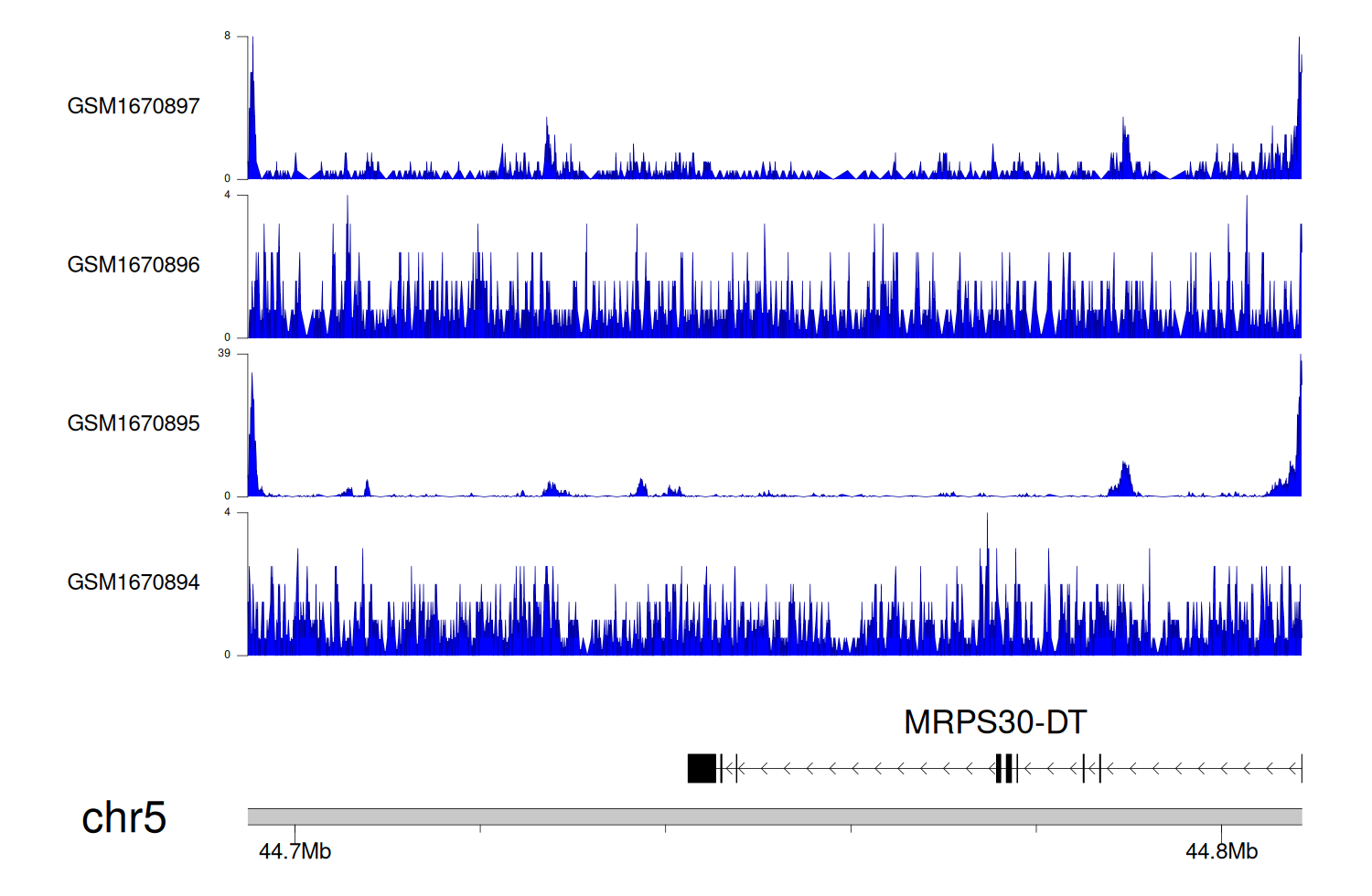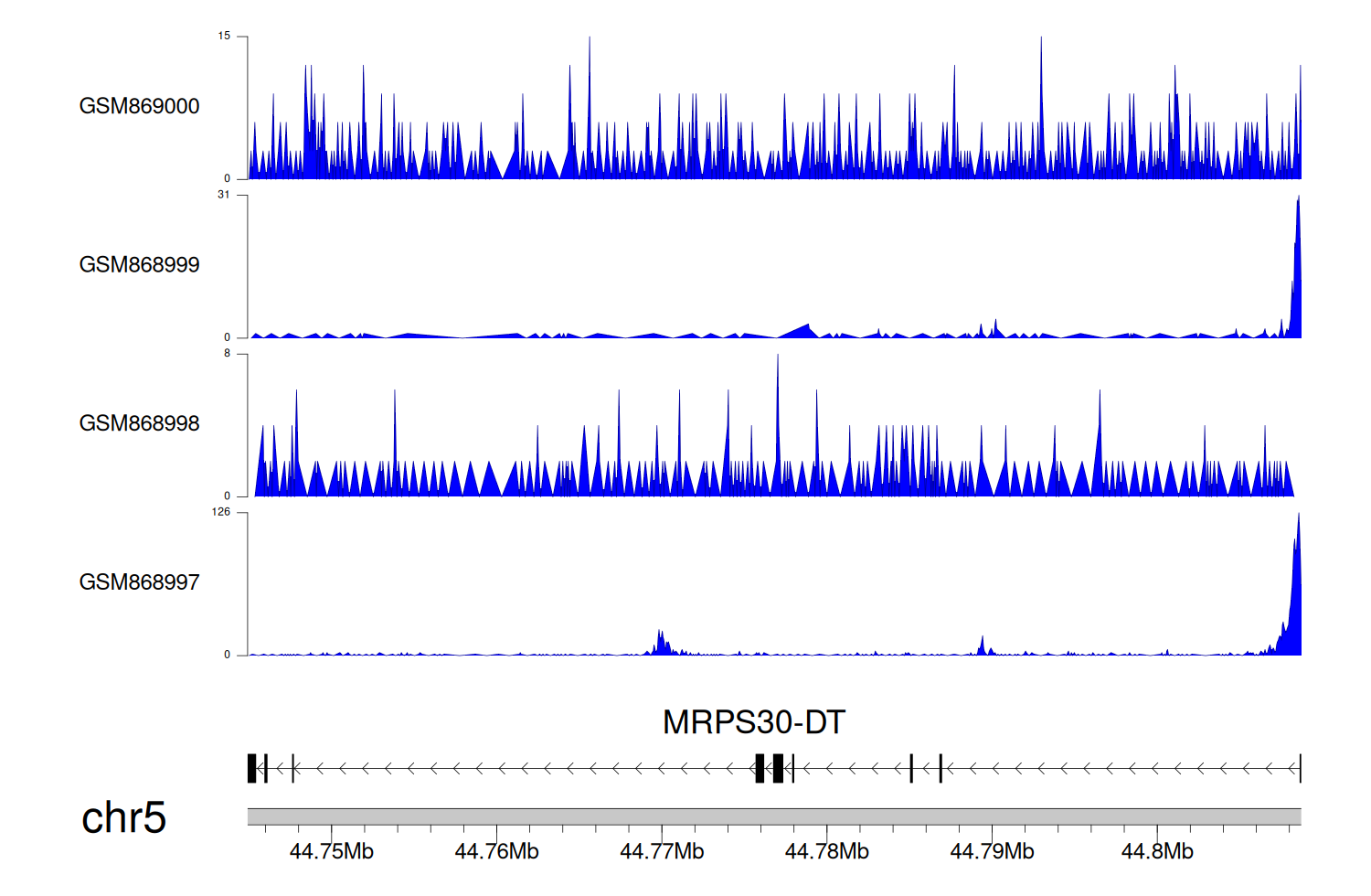 > Dataset: GSE68402 - MRPS30-DT peak across samples