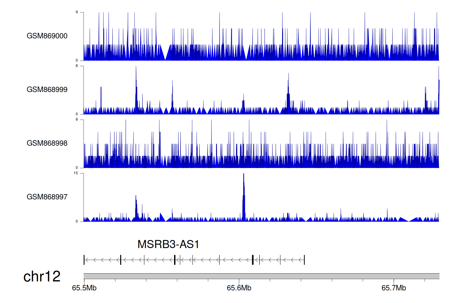 > Dataset: GSE68402 - MSRB3-AS1 peak across samples