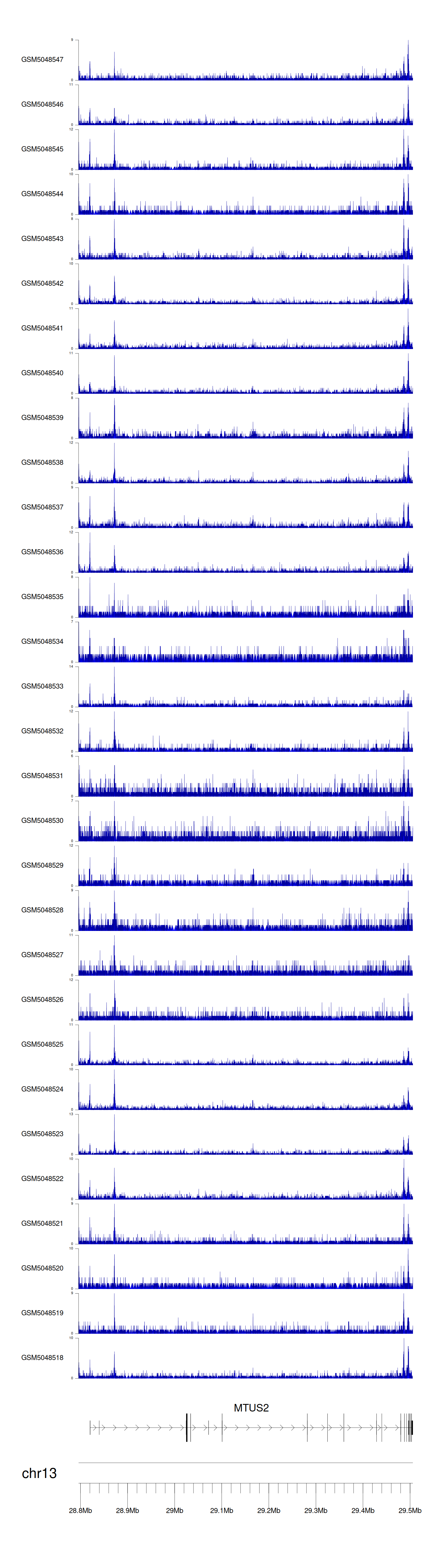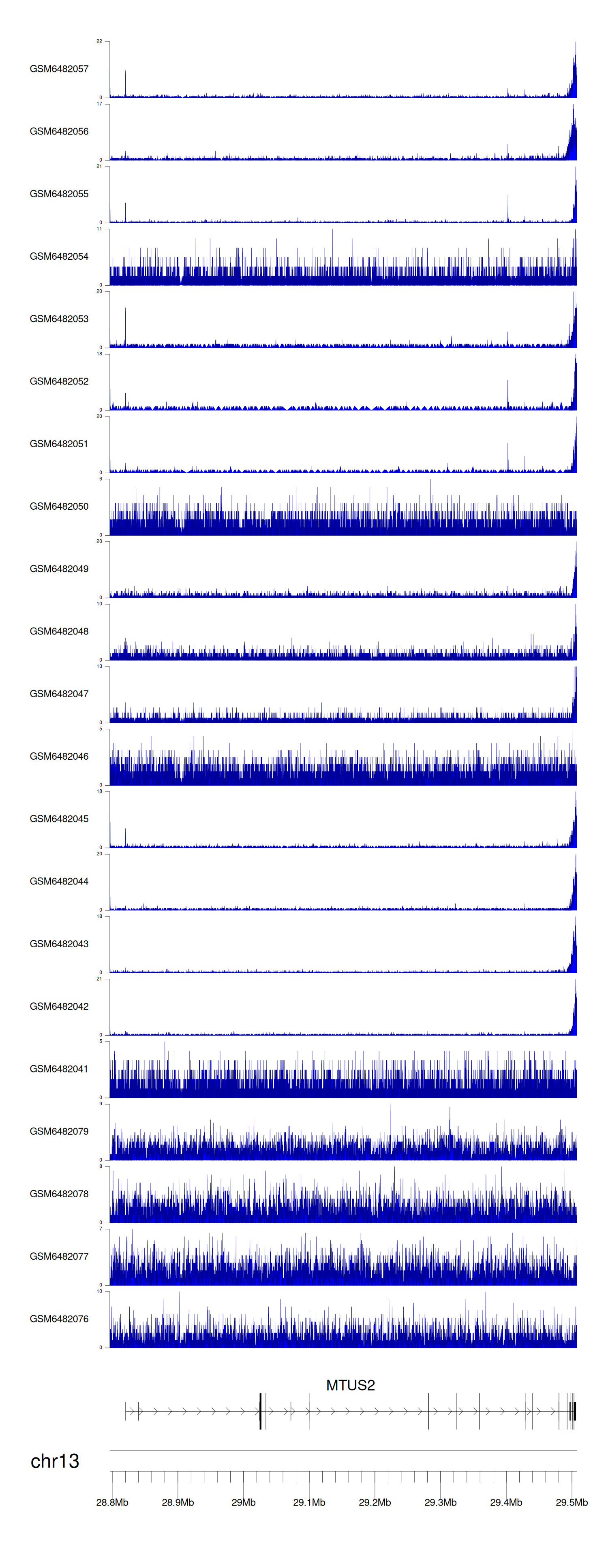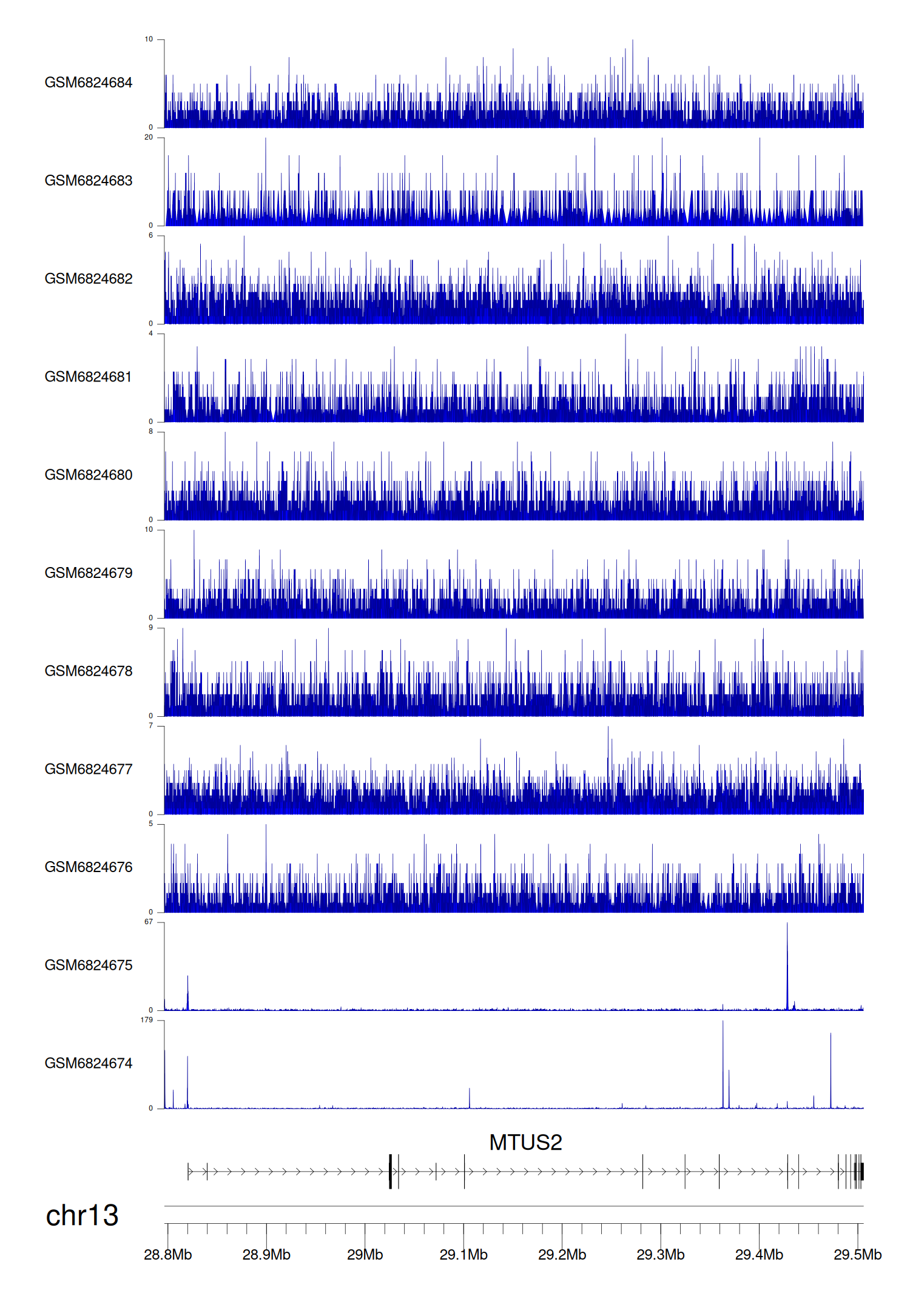 > Dataset: GSE144329 - MTUS2 peak across samples