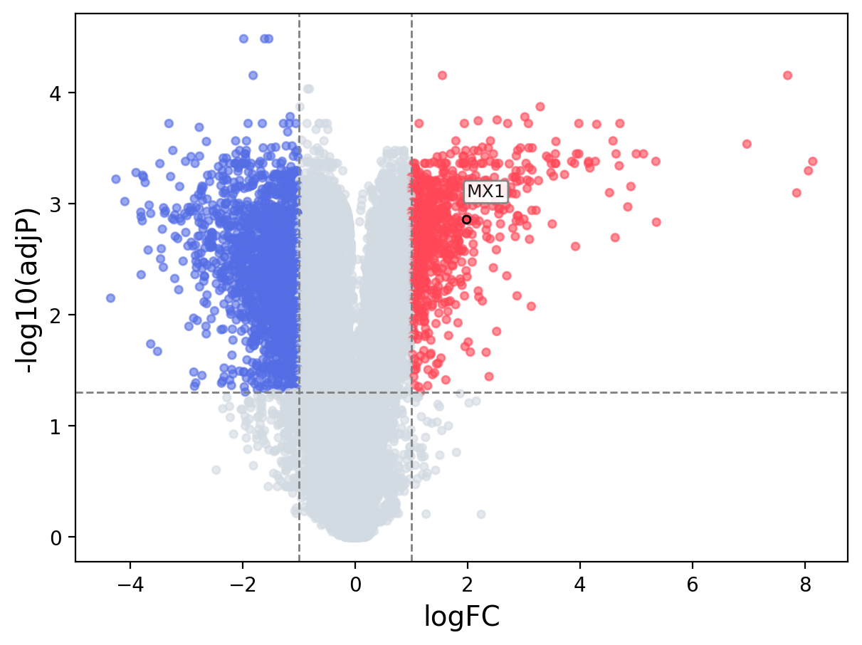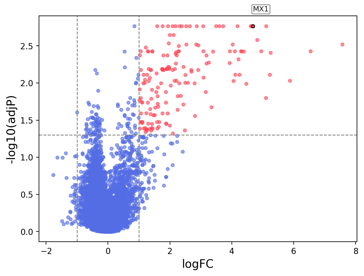 When the query gene is differentially changed in the dataset, a volcano/bar plot will be displayed.
