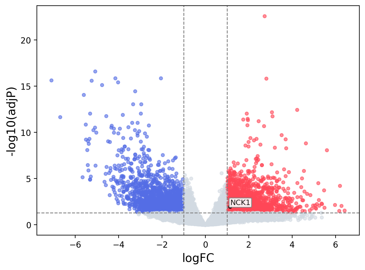 When the query gene is differentially changed in the dataset, a volcano/bar plot will be displayed.