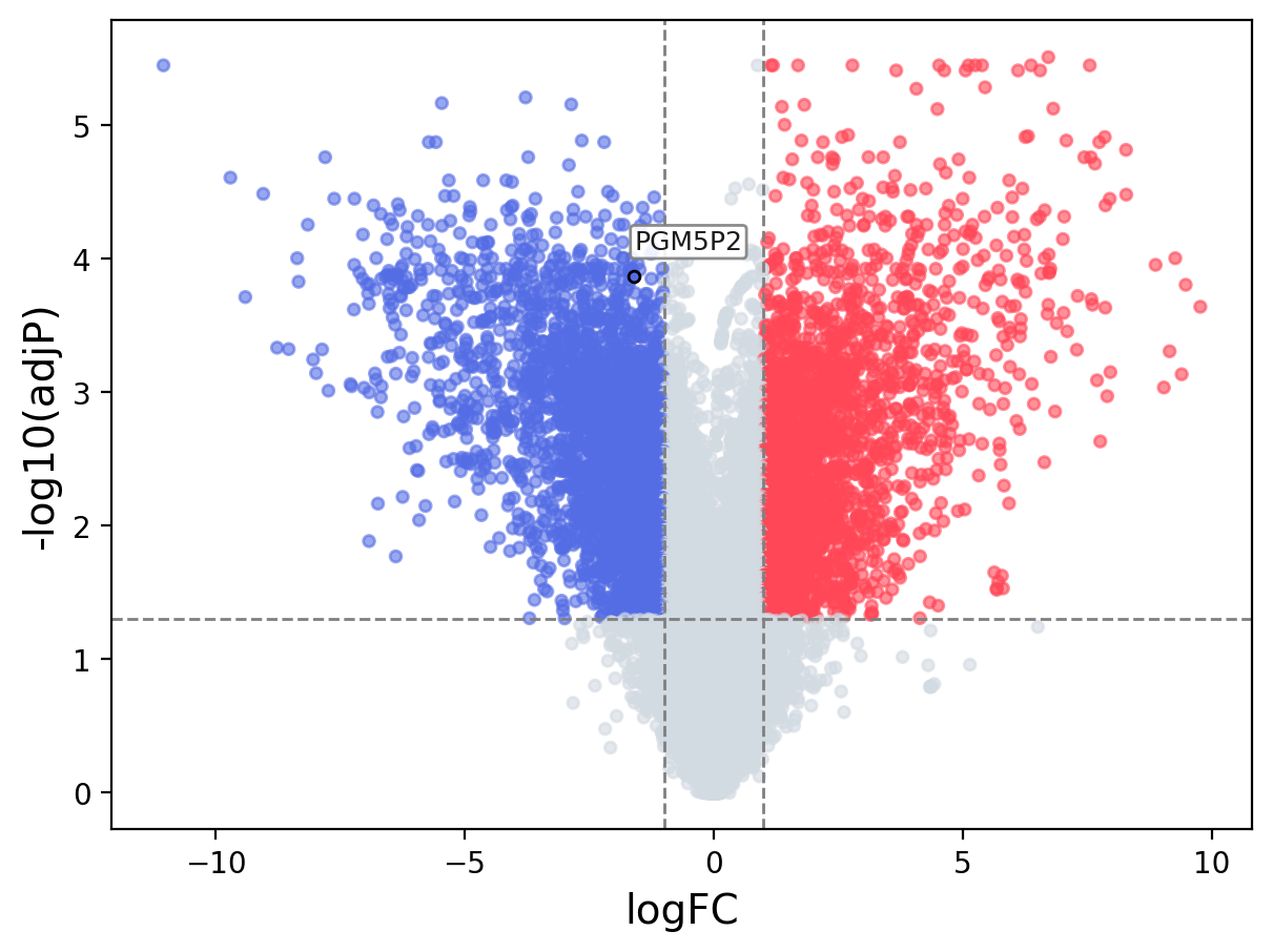 When the query gene is differentially changed in the dataset, a volcano/bar plot will be displayed.