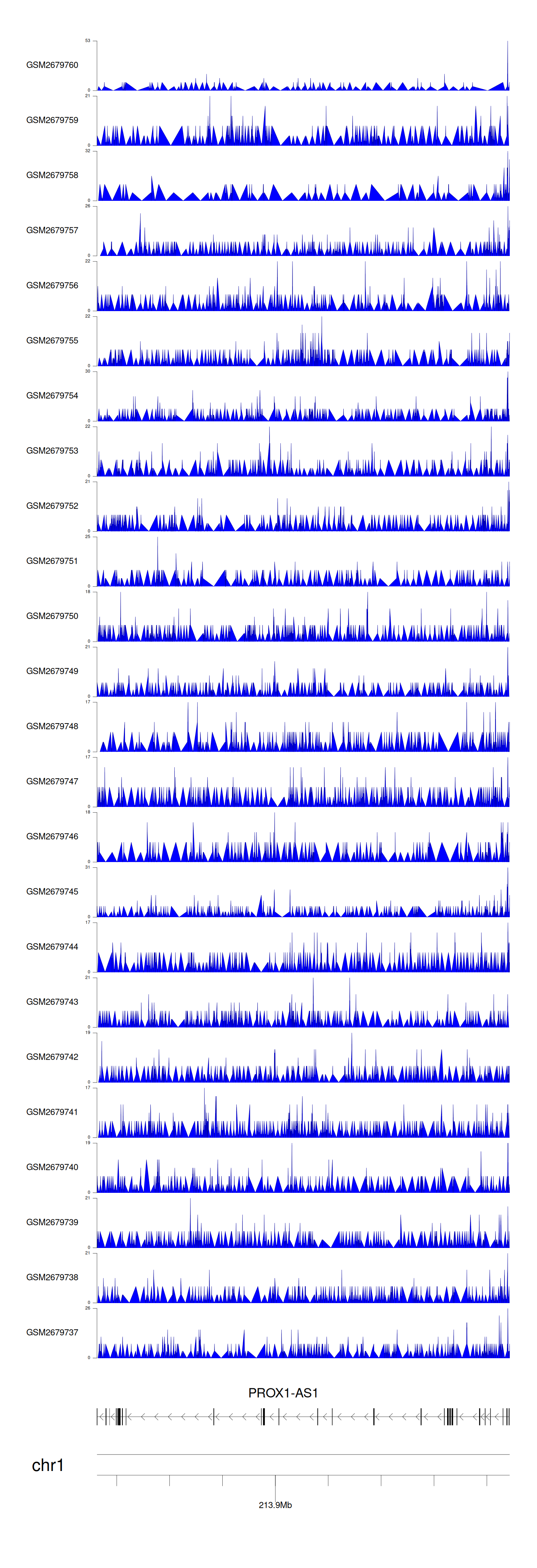 > Dataset: GSE30738 - PROX1-AS1 peak across samples
