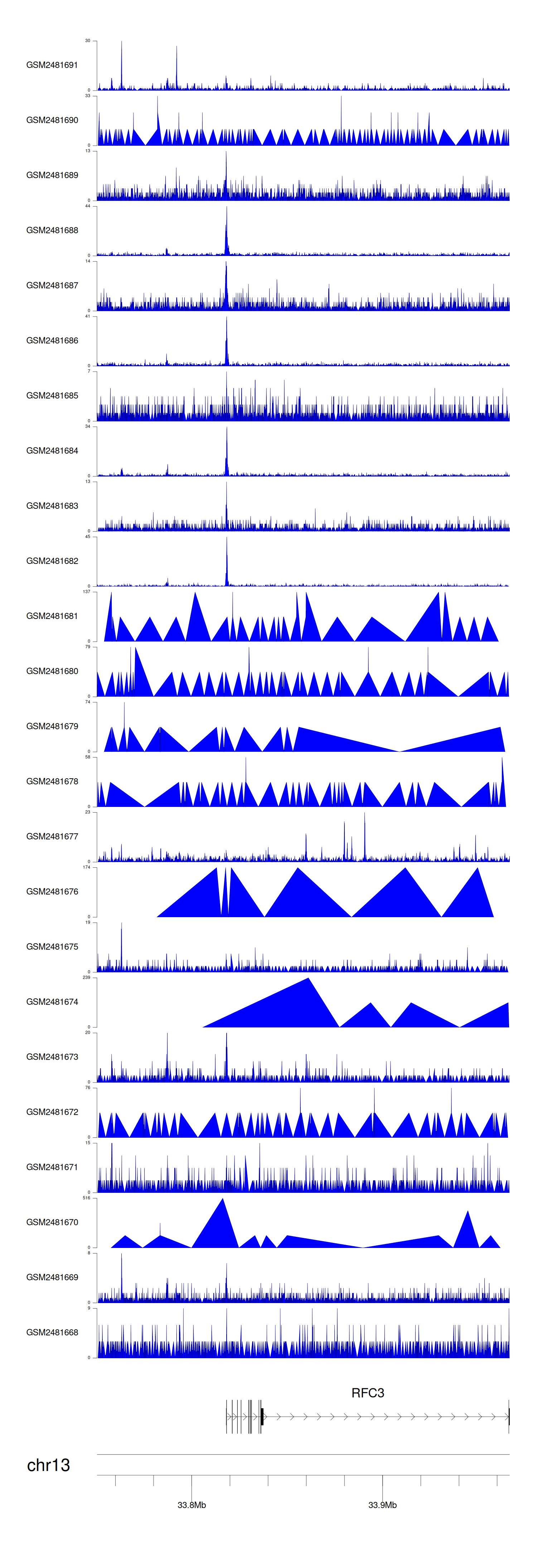 The elongation of primed DNA templates by DNA polymerase delta and DNA polymerase epsilon requires the accessory proteins proliferating cell nuclear antigen (PCNA) and replication factor C (RFC). RFC, also named activator 1, is a protein complex consisting of five distinct subunits of 140, 40, 38, 37, and 36 kDa. This gene encodes the 38 kDa subunit. This subunit is essential for the interaction between the 140 kDa subunit and the core complex that consists of the 36, 37, and 40 kDa subunits. Alternatively spliced transcript variants encoding distinct isoforms have been described. [provided by RefSeq, Jul 2008] |