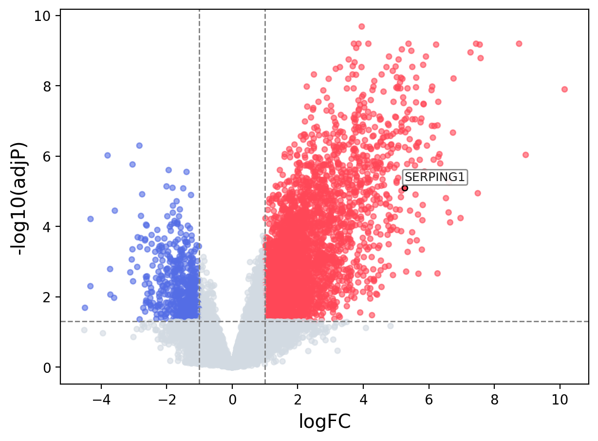 When the query gene is differentially changed in the dataset, a volcano/bar plot will be displayed.