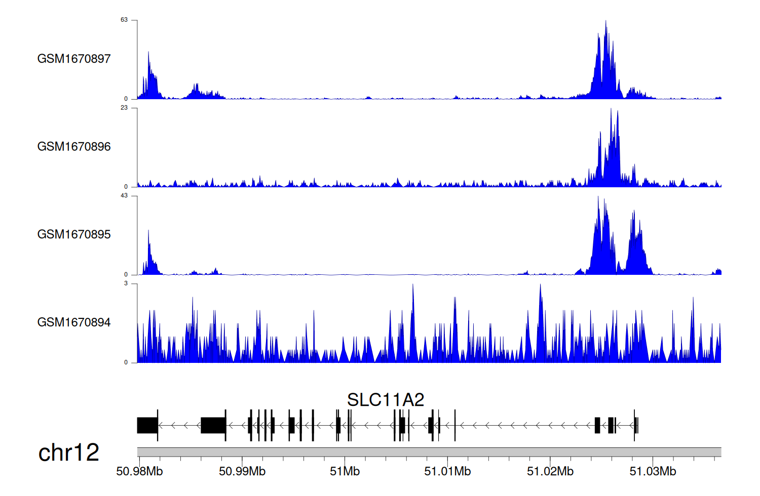 > Dataset: GSE68402 - SLC11A2 peak across samples