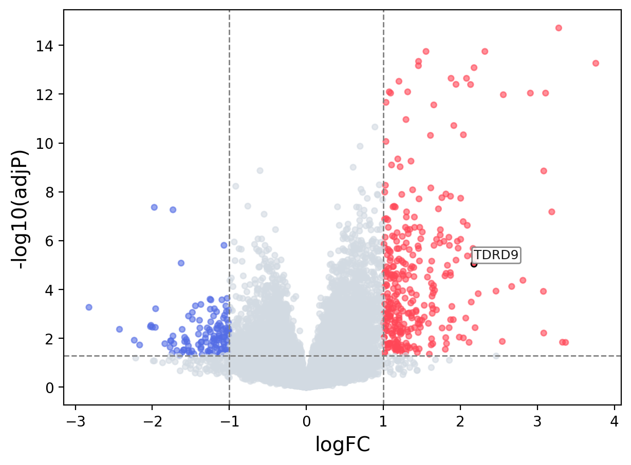 When the query gene is differentially changed in the dataset, a volcano/bar plot will be displayed.