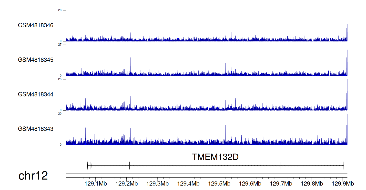 > Dataset: GSE131257 - TMEM132D peak across samples