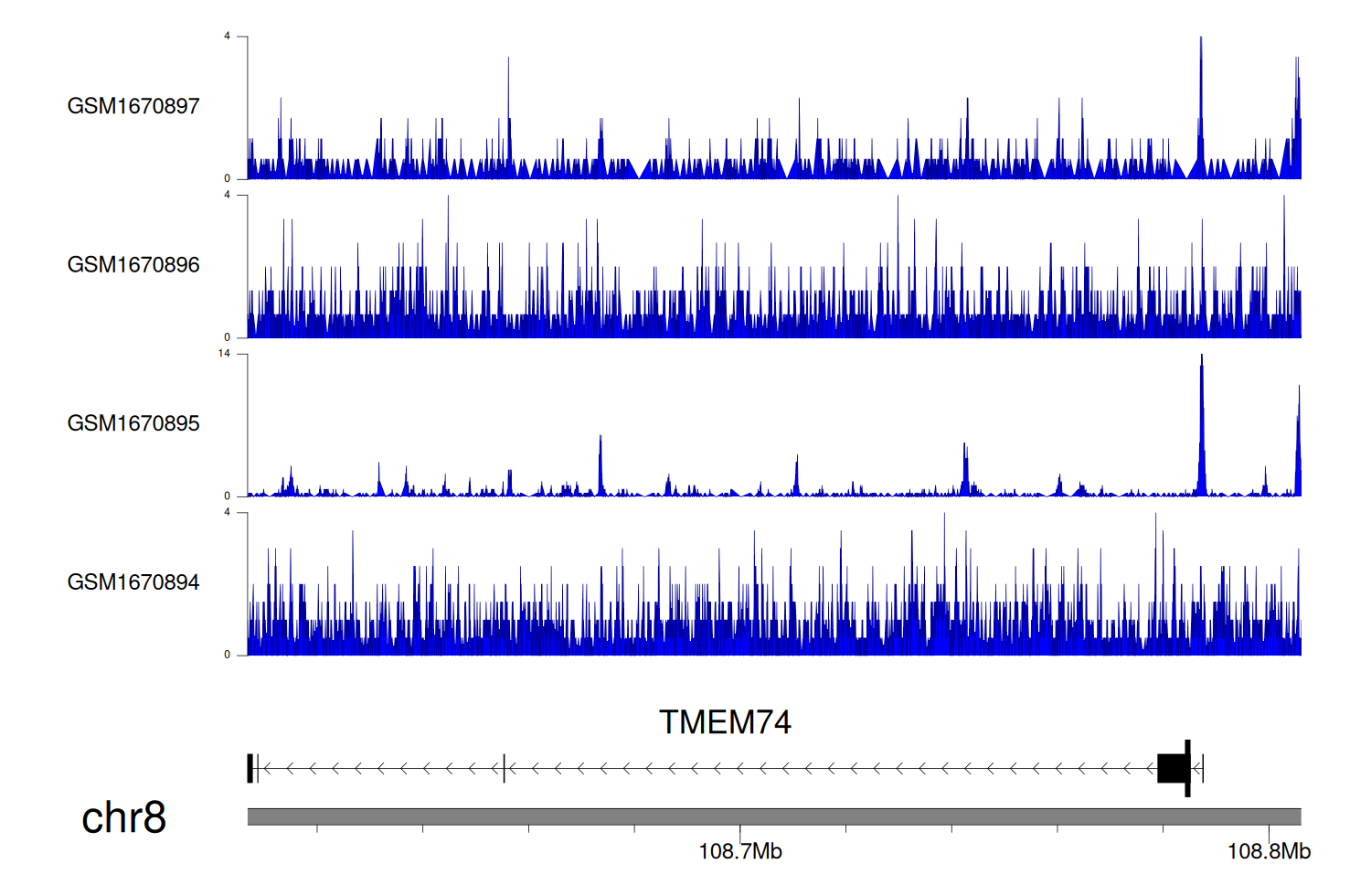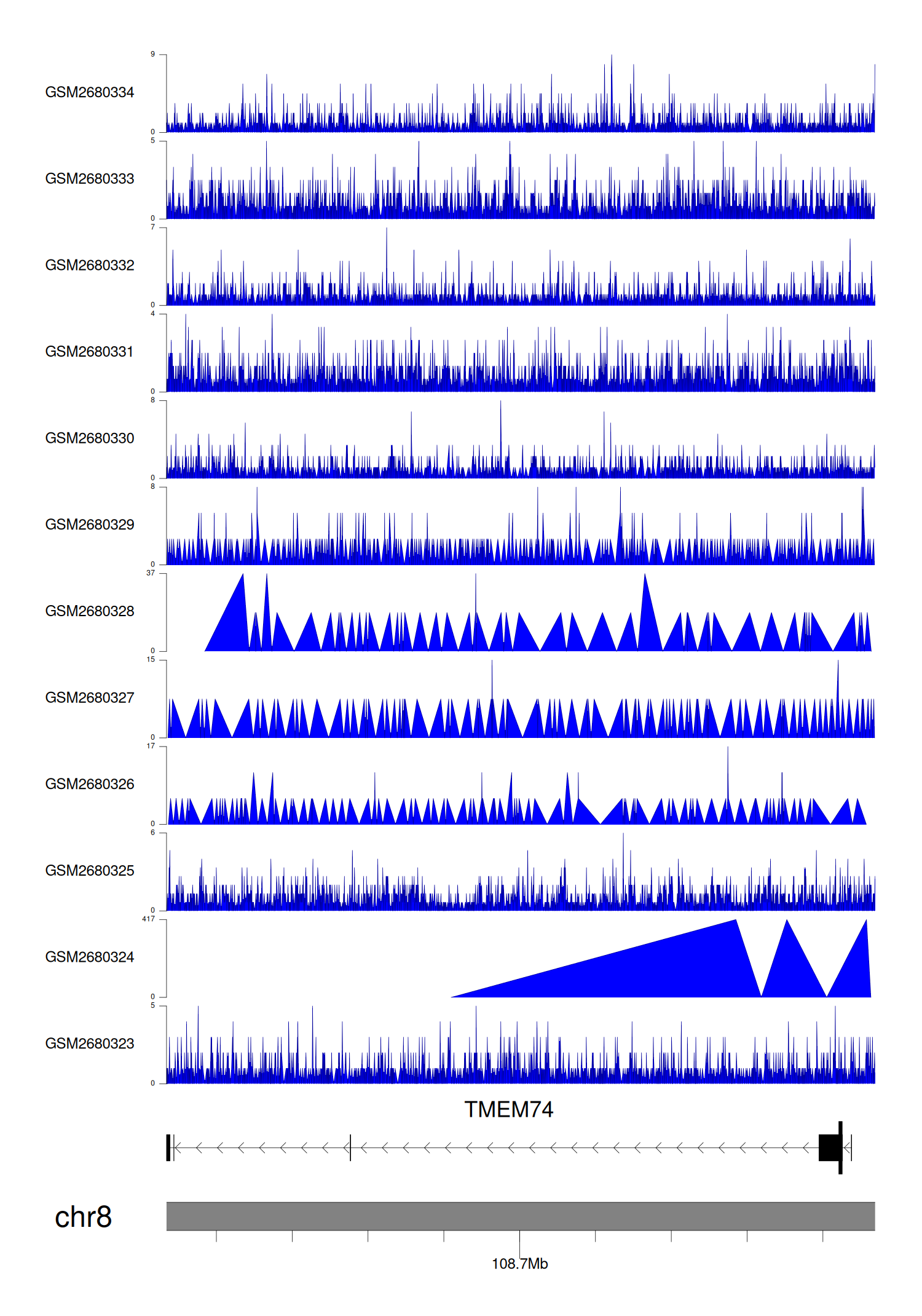 > Dataset: GSE100400 - TMEM74 peak across samples