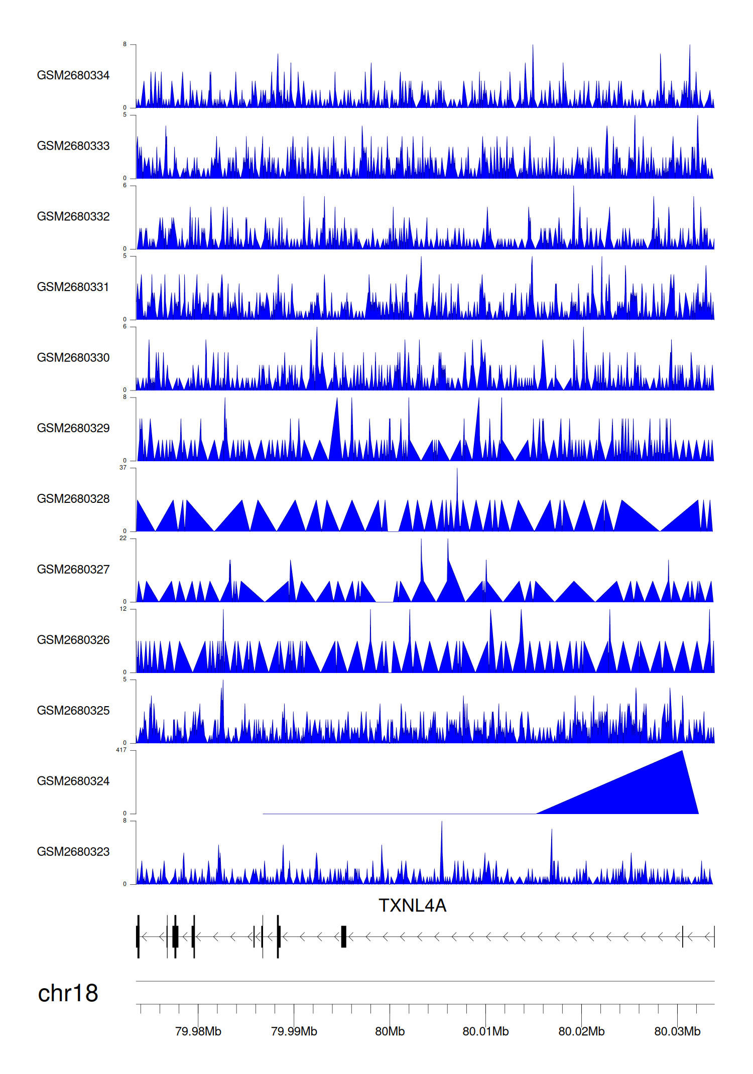 > Dataset: GSE68402 - TXNL4A peak across samples