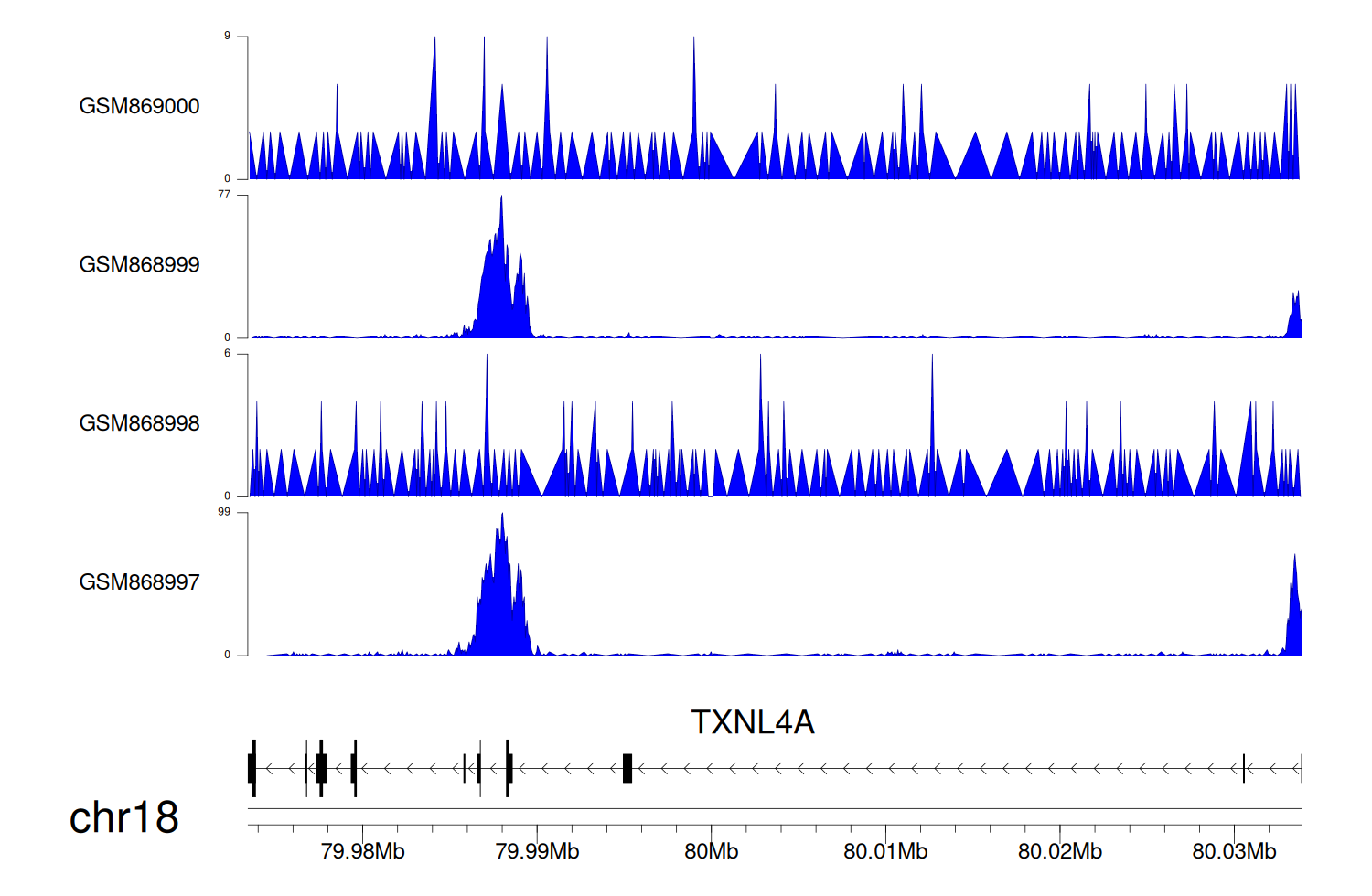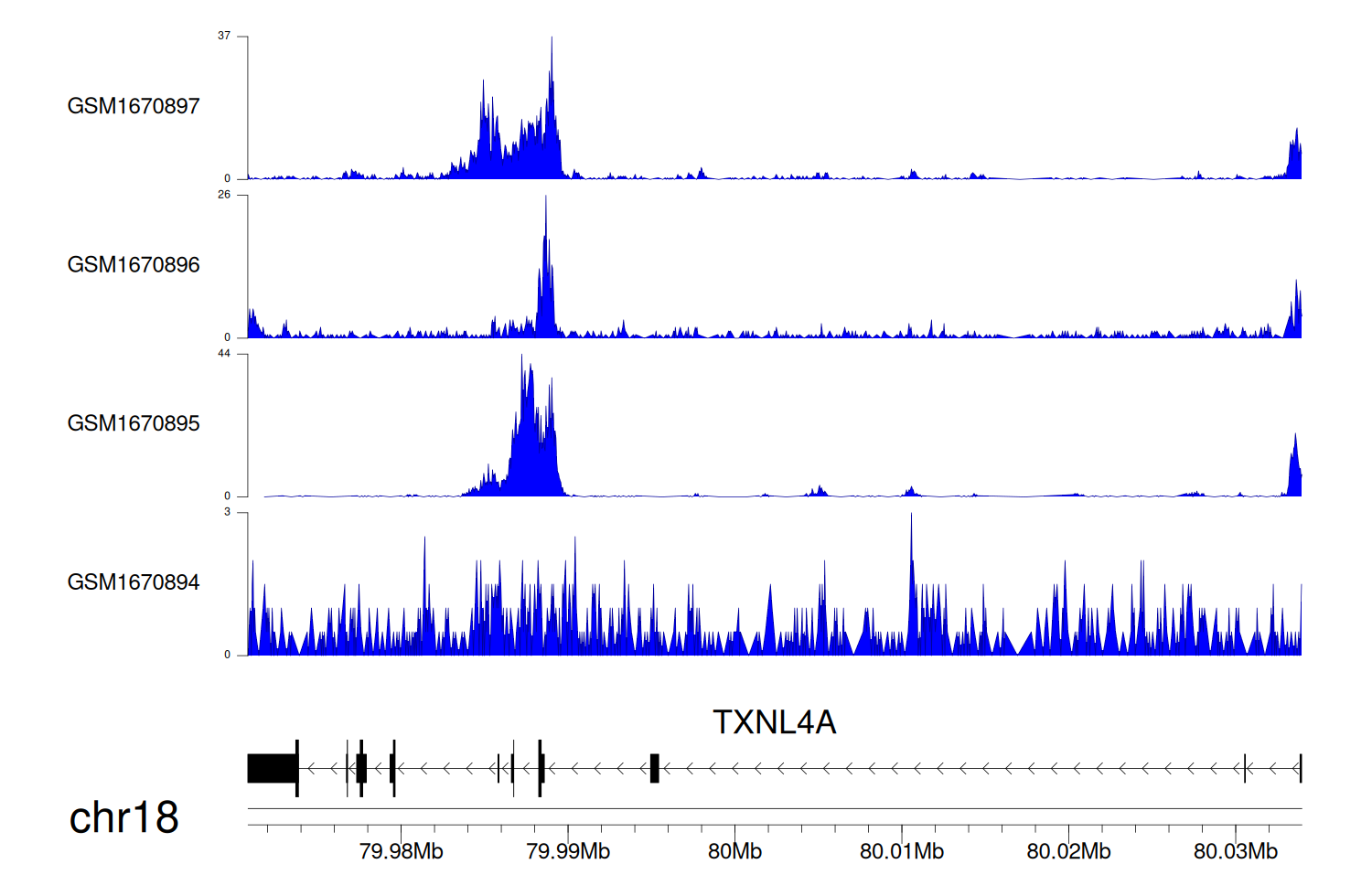 > Dataset: GSE35465 - TXNL4A peak across samples