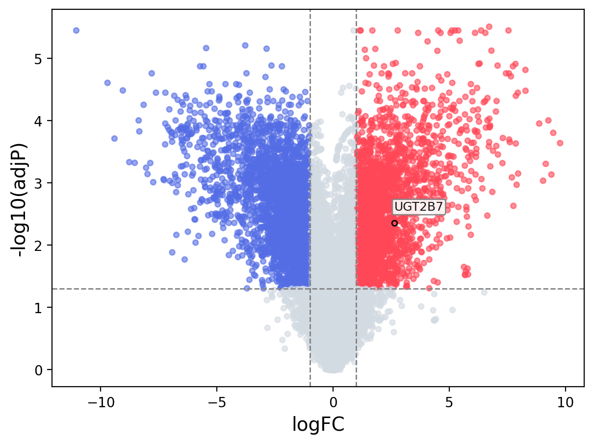 When the query gene is differentially changed in the dataset, a volcano/bar plot will be displayed.