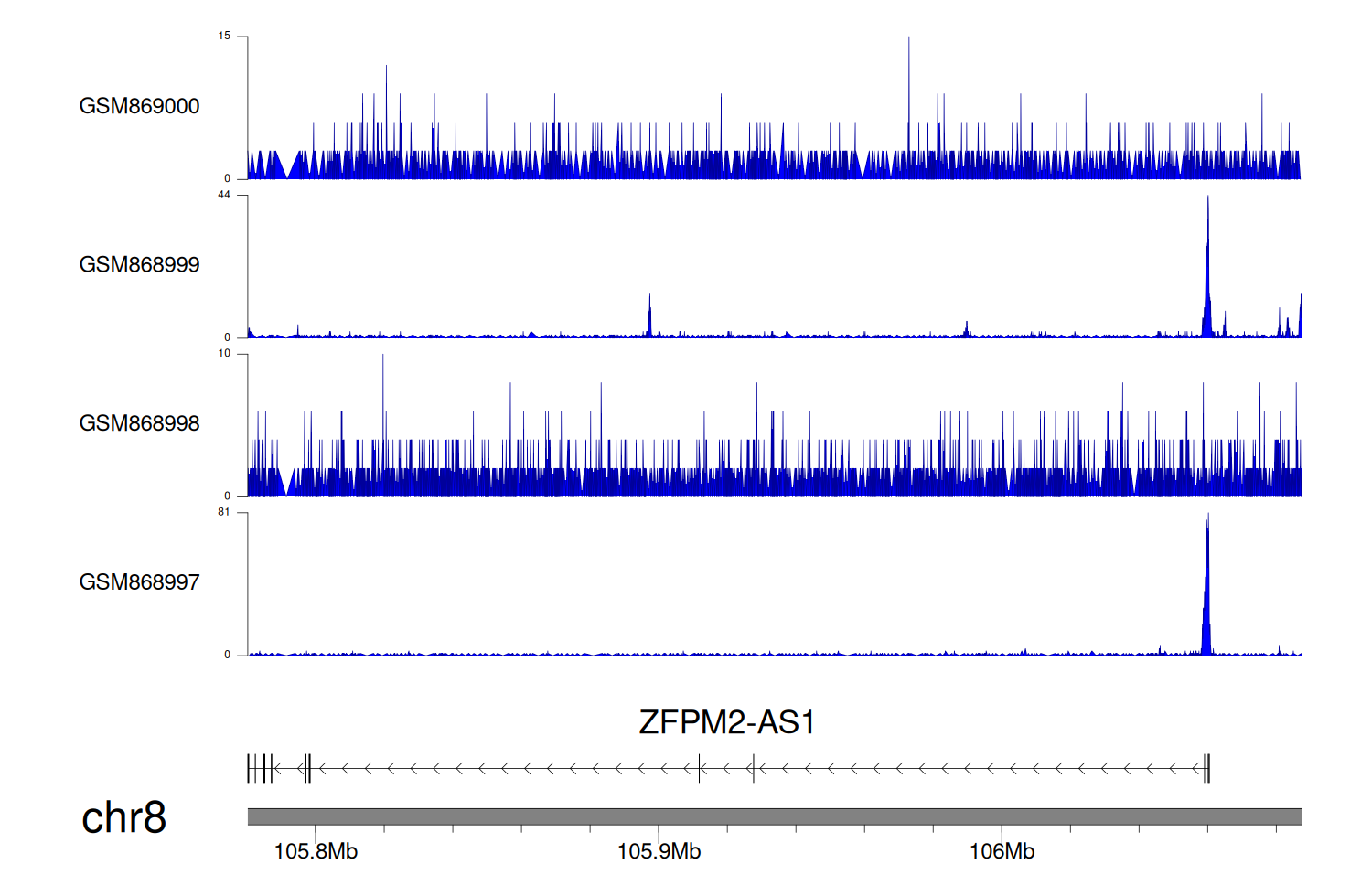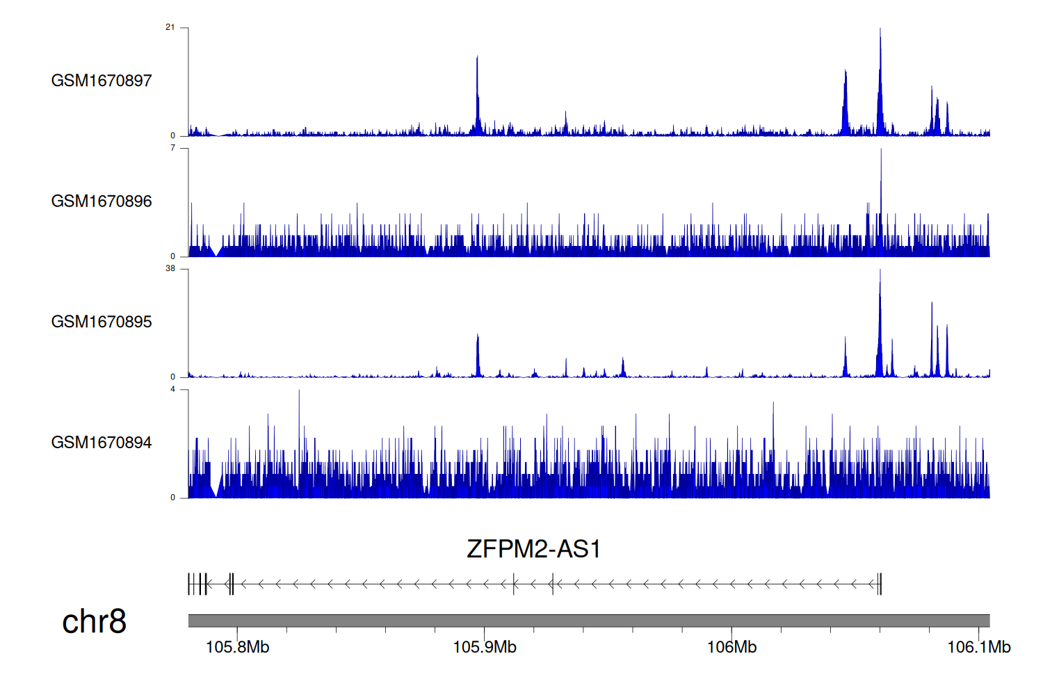 > Dataset: GSE68402 - ZFPM2-AS1 peak across samples