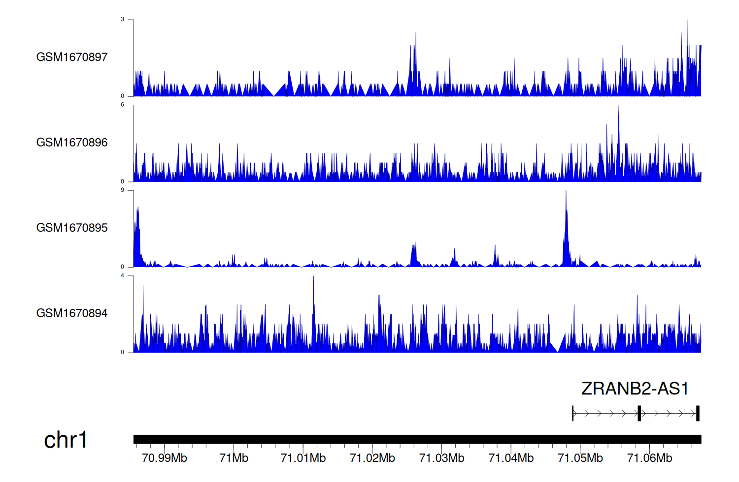 > Dataset: GSE68402 - ZRANB2-AS1 peak across samples